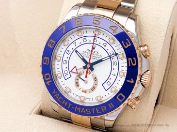 Yacht-Master II 為勞力士專為航海賽事設計的專業腕錶,型號 116681 結合不鏽鋼與 18K Everose 玫瑰金,錶徑達 44mm,是品牌少數具備複雜計時功能的運動錶。藍色陶瓷 Cerachrom 錶圈刻有金色倒數刻度,象徵海洋競賽精神與專業工具導向的設計語言。