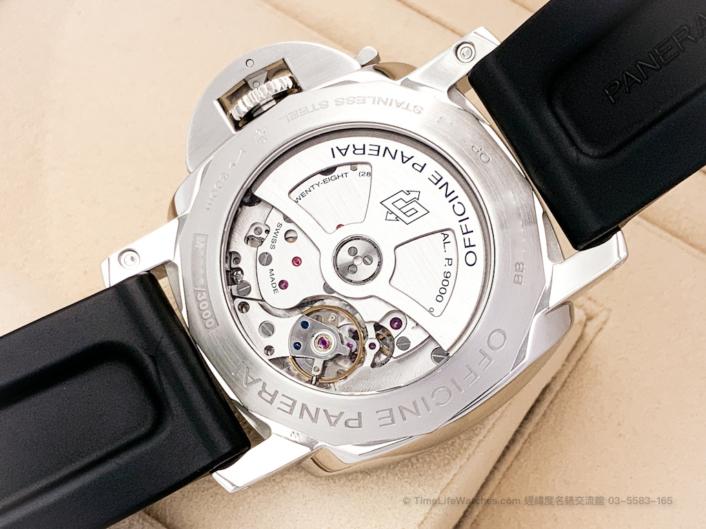 內部搭載 Panerai 自製 P.9000 自動上鍊機芯,具備雙發條盒,動力儲存達 3 日,並提供時間顯示與小秒針功能。機芯結構堅實可靠,符合沛納海對專業軍用淵源的堅持。