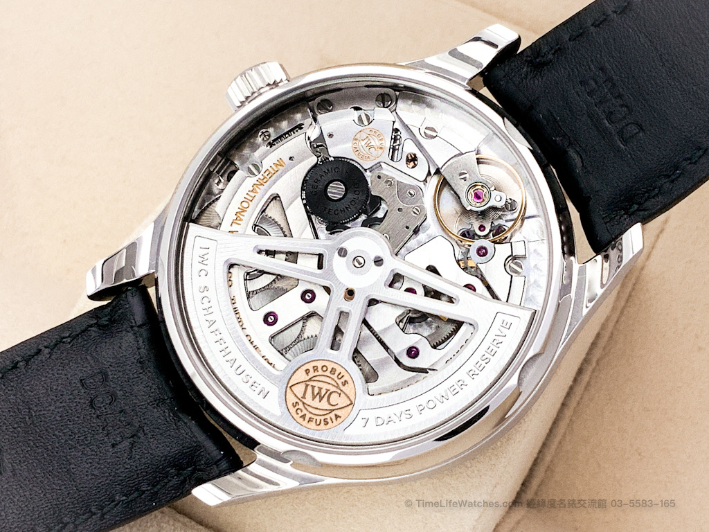 內部搭載 IWC 自製 52010 自動上鍊機芯,配備雙發條盒,動力儲存長達 7 日。具備比勒頓自動上鍊系統與陶瓷零件,確保耐用性與效率,並透過透明底蓋可見精緻打磨。