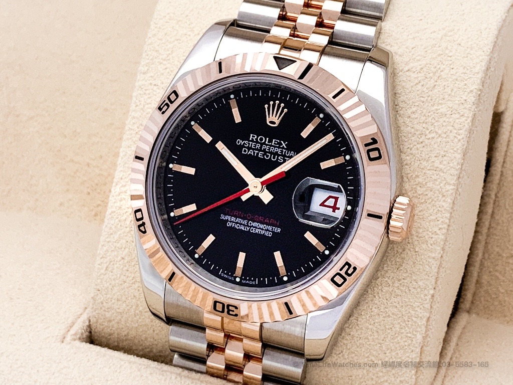 Turn-O-Graph 116261 是勞力士經典 Datejust 系列中最具特色的支線之一,結合旋轉刻度錶圈與日期功能,被譽為「Datejust 與運動錶的交會點」。此版本採 Everose Rolesor 結構,融合不鏽鋼與 18K 玫瑰金,兼具運動感與優雅氣質。