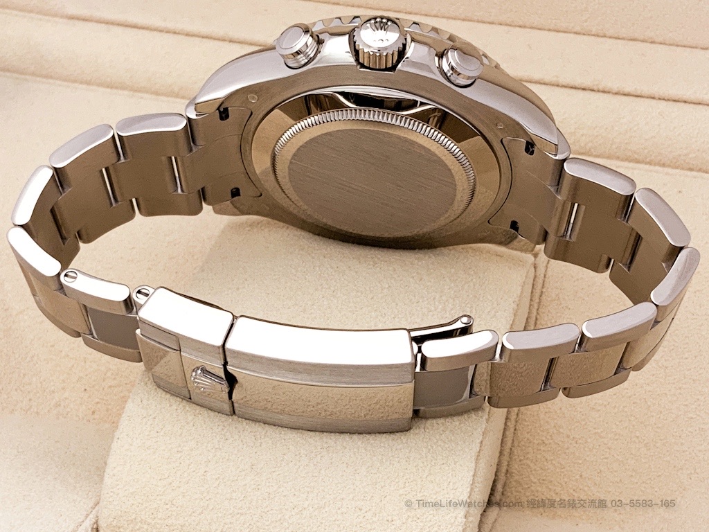 Oyster 錶帶配備白金三板鏈節與 Oysterlock 安全摺疊扣,兼具舒適與堅固。鉑金外圈刻度經霧面與拋光雙重修飾,細節層次極為豐富。
