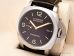 棕色錶盤搭配金色夜光指針與阿拉伯數字時標,形成溫潤的復古對比。9 點鐘位置設小秒針,3 點鐘設日期窗,佈局對稱且延續 Luminor 系列經典風格。