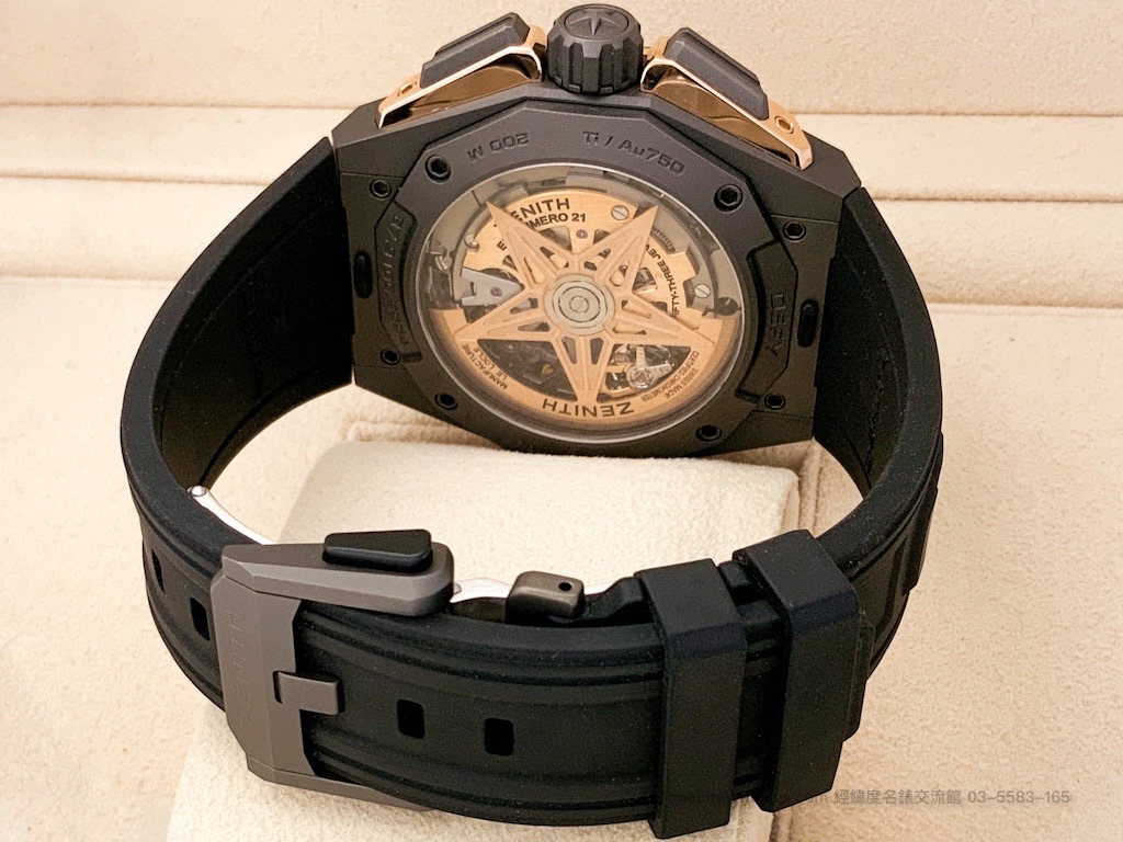 | 說明: | 黑鈦合金造製錶殼~玫瑰金底框~黑灰金鏤空造型錶盤~夜光時標~藍寶石水晶鏡片~透明錶背~搭載El Primero 9004 自動上鍊機芯 ~搭配原廠黑色膠帶~原廠黑鈦合金折疊扣! |