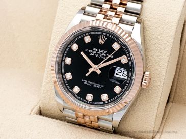 Datejust 36 參考編號 126231 採用 Rolesor Everose 半玫瑰金結構,結合不鏽鋼與 18K Everose 金材質。黑色放射紋錶盤鑲嵌 10 顆鑽石時標,光線下呈現低調而奢華的光澤。