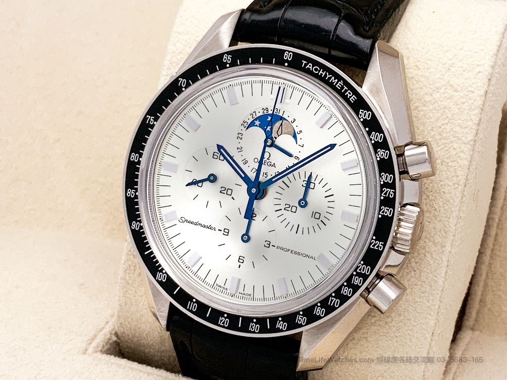 此型號採用銀色面盤搭配藍色指針,整體視覺明亮而富有層次。面盤最具辨識度之處,在於月相與指針式日期顯示設於 12 點鐘方向,形成不同於一般 Speedmaster 的配置語言;配合三眼計時盤面,讓整體布局在經典之中多出一分天文時計的優雅氣息。