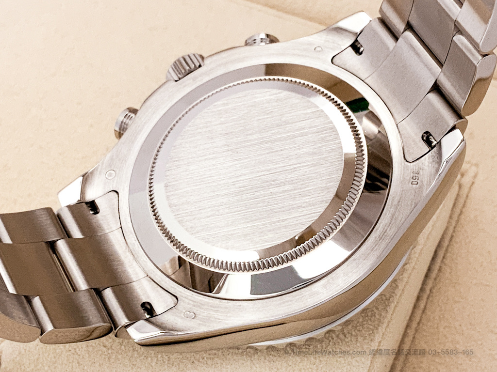 Oyster 錶帶配備白金三板鏈節與 Oysterlock 安全摺疊扣,兼具舒適與堅固。鉑金外圈刻度經霧面與拋光雙重修飾,細節層次極為豐富。