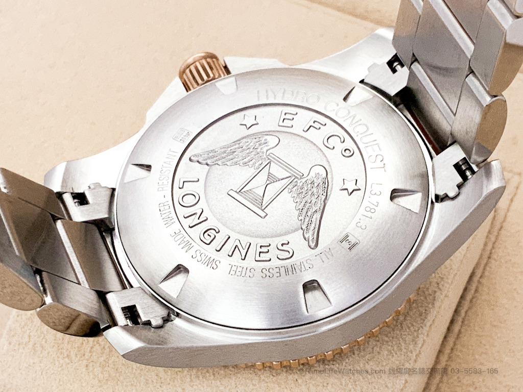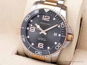 HydroConquest 為浪琴旗下專業潛水系列代表。此款 L3.781.3.78.7 採用灰色陶瓷錶圈與玫瑰金 PVD 雙色結構設計,呈現高雅與運動兼具的風格。灰面放射紋錶盤搭配金色立體時標與指針,整體質感細緻,對比層次豐富。